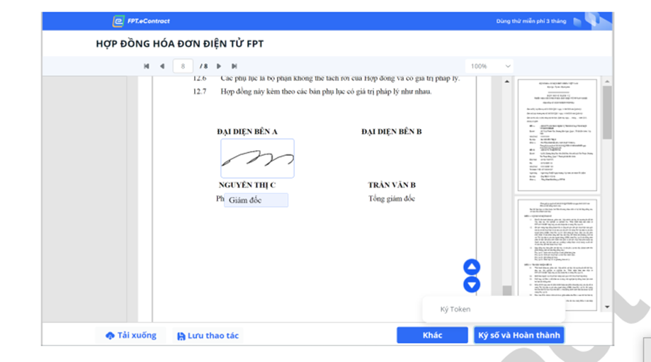 Sau khi truy cập người đại diện bên A sẽ review lại hợp đồng. Nếu hợp đồng ổn không có vấn đề gì cần thay đổi thì tiến hành kéo xuống cuối trang và chọn  **check box**: “*Tôi đã đọc, hiểu, đồng ý với nội dung của văn bản (thông điệp dữ liệu)điện tử và thống nhất sử dụng phương thức điện tử để thực hiện giao dịch*”, hệ thống mới cho phép NSD bấm chọn nút “**Ký số và hoàn thành**”.